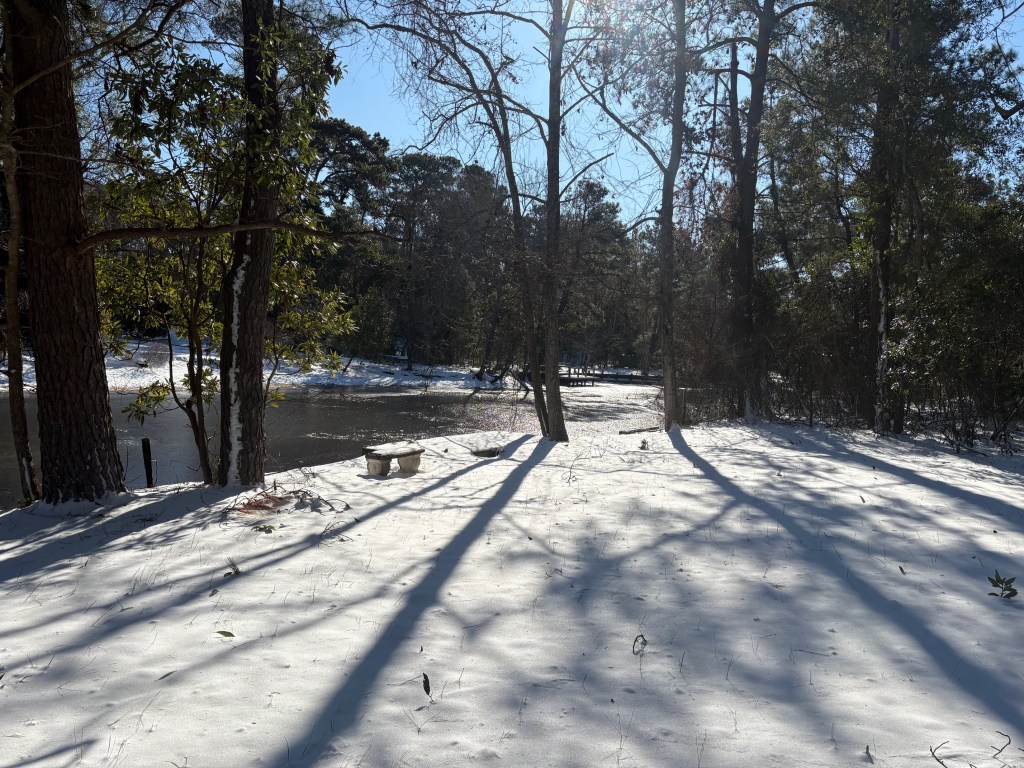The snowy setting this morning on a frozen canal just north of the Dick White Bridge on East Dogwood Trail was serene and calm.