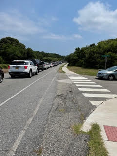 Vacationer traffic cutting through Chicahauk backed up yesterday from the traffic light at the intersection of Chicahauk Trail and Ocean Boulevard (N.C. Hwy. 12) to at least Otter Slide Lane, according to a Chicahauk homeowner who sent this photograph to The Beacon. While a higher volume of northbound traffic, attributable to both the high-season holiday and the banner summer the Outer Banks is enjoying, surely contributed to the traffic jam in Chicahauk yesterday–as well as to other backups throughout Southern Shores–we would speculate further that WAZE’s agreement with the Town not to divert motorists to the South Dogwood Trail/East Dogwood Trail cut-through led to more vacationers cutting through Chicahauk. Despite the left-turn ban and the local-traffic-only road closures, the usual congestion hot spots in the Southern Shores dunes, particularly on Hillcrest Drive, still had bumper-to-bumper traffic throughout yesterday afternoon.