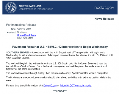 (For those who are unfamiliar with the area: Ocean Boulevard is N.C. Hwy. 12 until the road splits, going north, at the cell tower park. If you stay to the right of the tower, you will continue on the “local” section of Ocean Boulevard, which is Town-owned; if you veer to the left, you will be on a section of N.C. 12 that is called Duck Road and is State-owned.)
